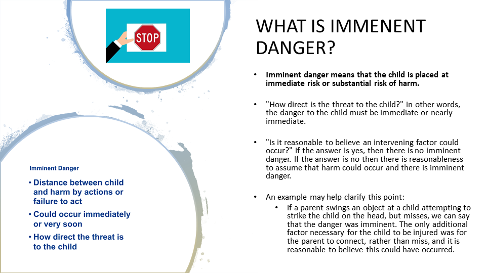 - Imminent danger means that the child is placed at immediate risk or substantial risk of harm.
