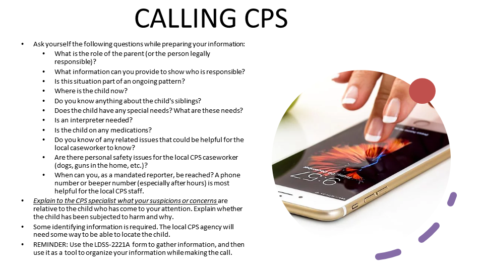 - When can you, as a mandated reporter, be reached? A phone number or beeper number (especially after hours) is most helpful for the local CPS staff.
