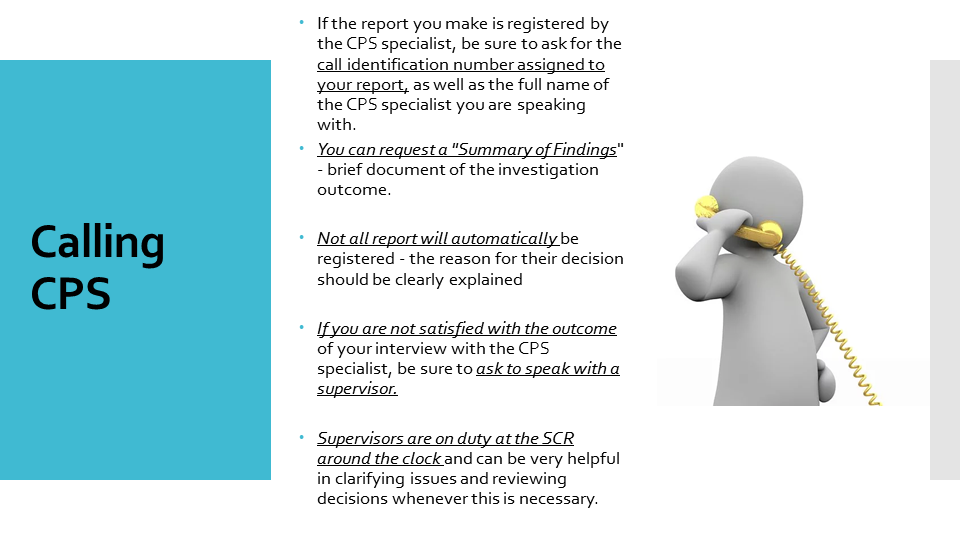 - If the report you make is registered by the CPS specialist, be sure to ask for the call identification number assigned to your report, as well as the full name of the CPS specialist you are speaking with.