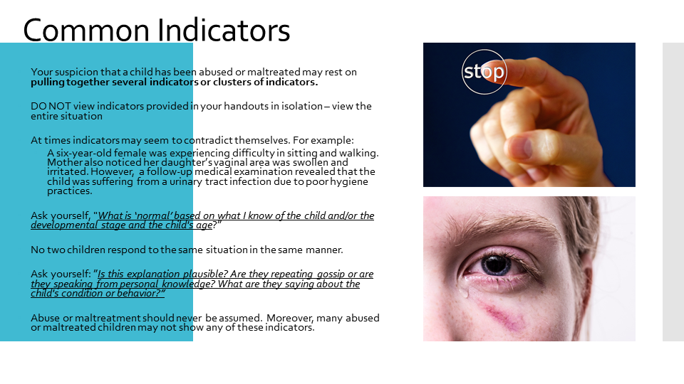 Abuse or maltreatment should never be assumed. Moreover, many abused or maltreated children may not show any of these indicators.