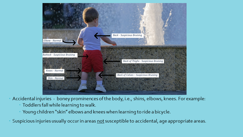 Suspicious injuries usually occur in areas not susceptible to accidental, age appropriate areas.