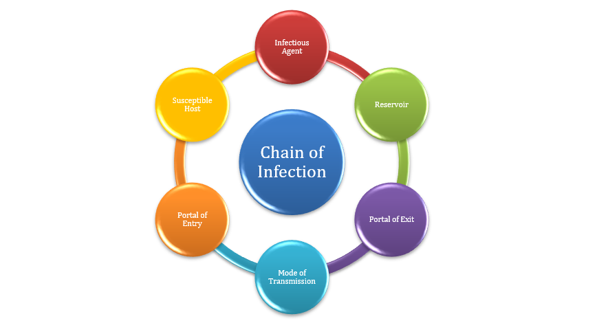 The Chain of Infection comprises of a series of vital links that causes infectious diseases; namely, a pathogen (infectious agent or germ), reservoir (human, animal, environmental), portal of exit, mode of transmission, portal of entry, and susceptible host.