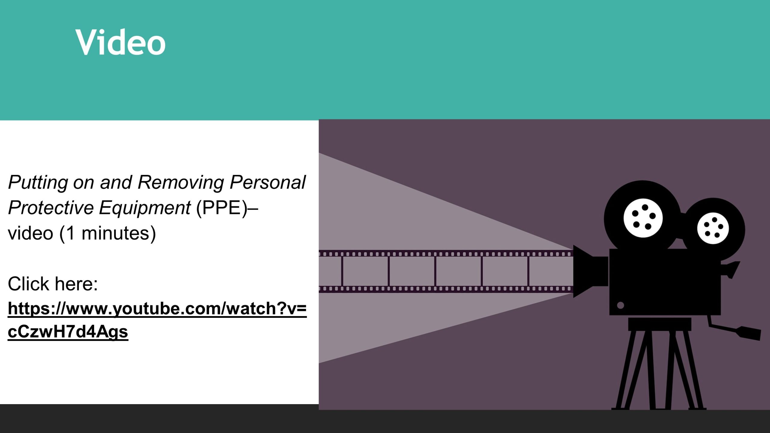 To access “Putting on and Removing Personal Protective Equipment (PPE)” video, click herehttps://www.youtube.com/watch?v=cCzwH7d4Ags