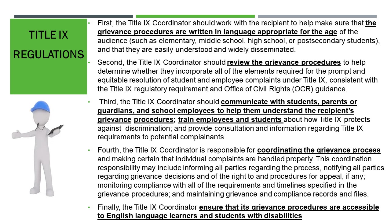 - Finally, the Title IX Coordinator ensure that its grievance procedures are accessible to English language learners and students with disabilities.