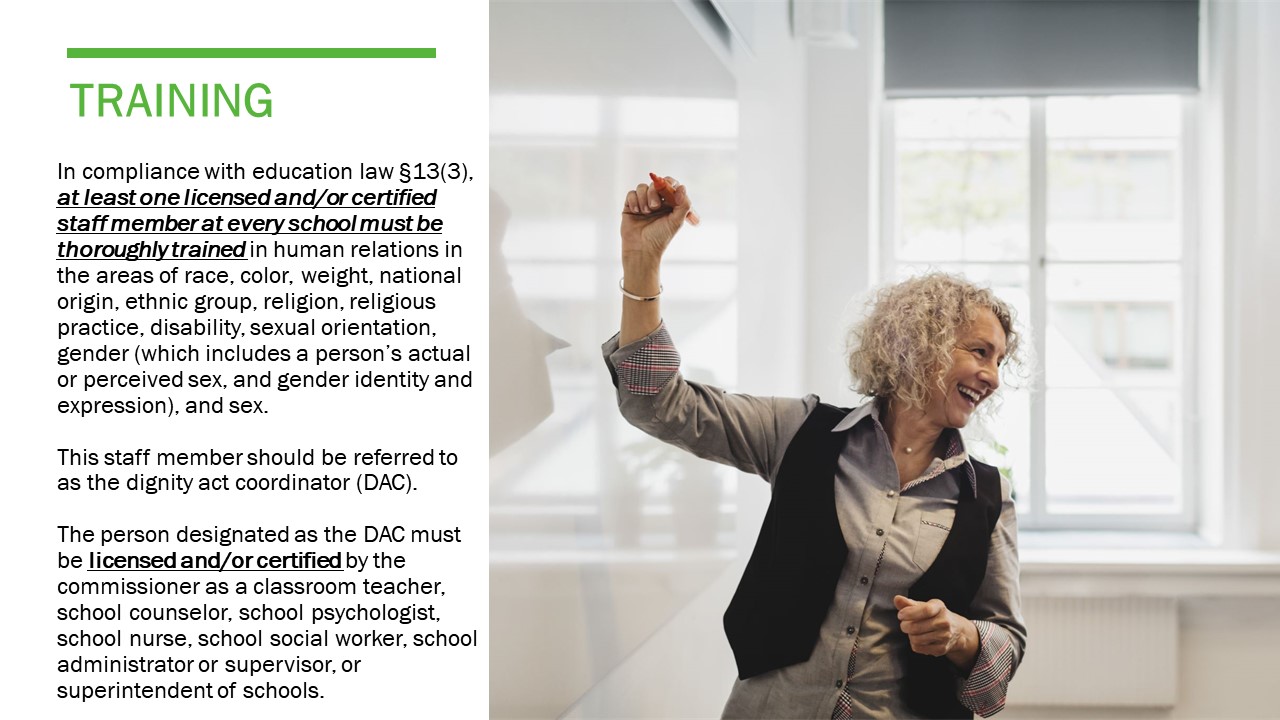 - In compliance with education law §13(3), at least one licensed and/or certified staff member at every school must be thoroughly trained in human relations in the areas of race, color, weight, national origin, ethnic group, religion, religious practice, disability, sexual orientation, gender (which includes a person’s actual or perceived sex, and gender identity and expression), and sex.