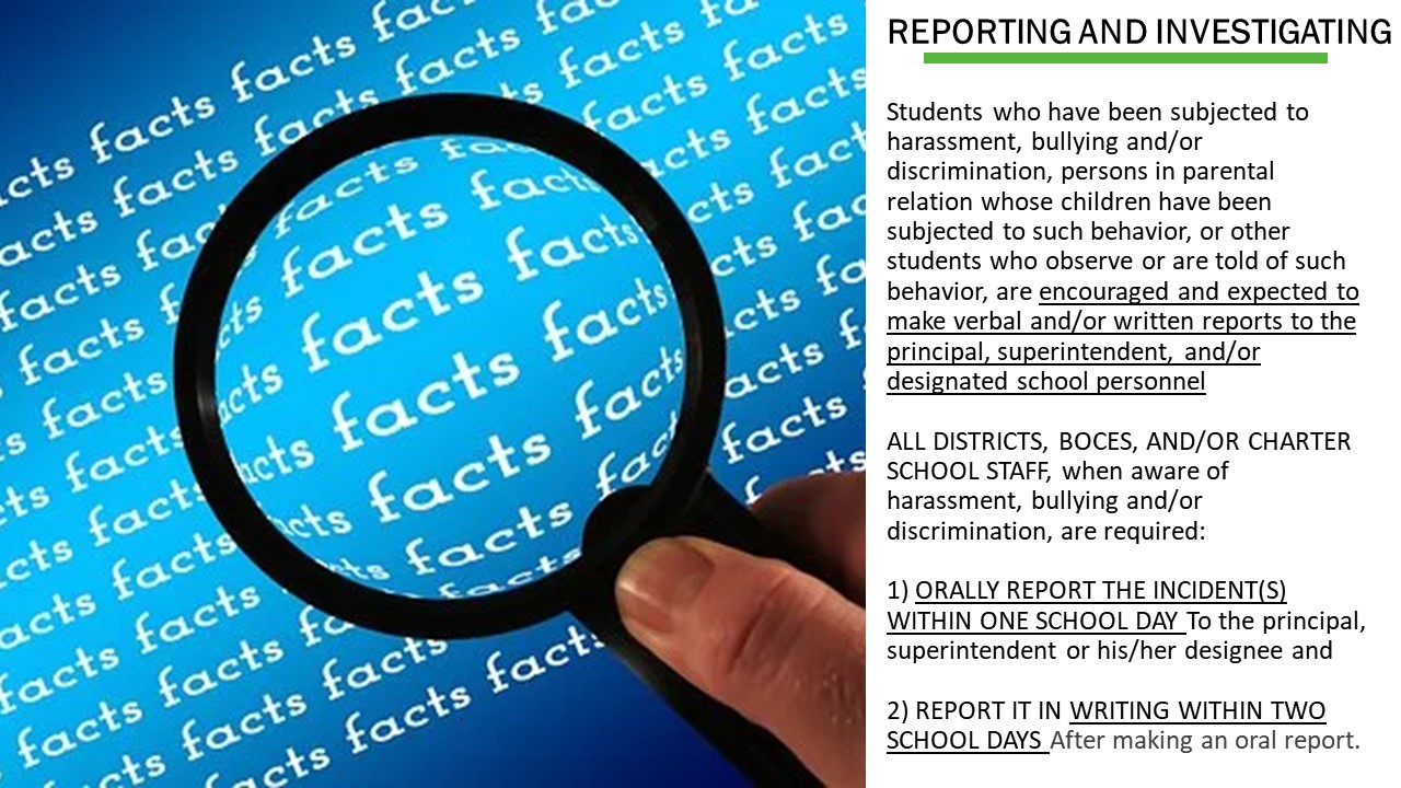 - All districts, BOCES, and/or charter school staff, when aware of harassment, bullying and/or discrimination, are required:
