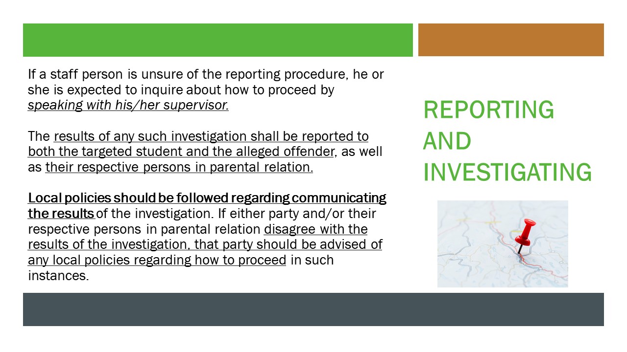 - Local policies should be followed regarding communicating the results of the investigation. If either party and/or their respective persons in parental relation disagree with the results of the investigation, that party should be advised of any local policies regarding how to proceed in such instances.