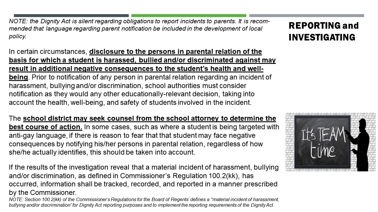 - NOTE: the dignity act is silent regarding obligations to report incidents to parents. It is recommended that language regarding parent notification be included in the development of local policy.