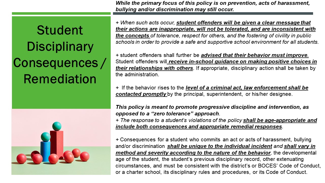 - Consequences for a student who commits an act or acts of harassment, bullying and/or discrimination shall be unique to the individual incident and shall vary in method and severity according to the nature of the behavior, the developmental age of the student, the student’s previous disciplinary record, other extenuating circumstances, and must be consistent with the district’s or BOCES’ Code of Conduct, or a charter school, its disciplinary rules and procedures, or its Code of Conduct.