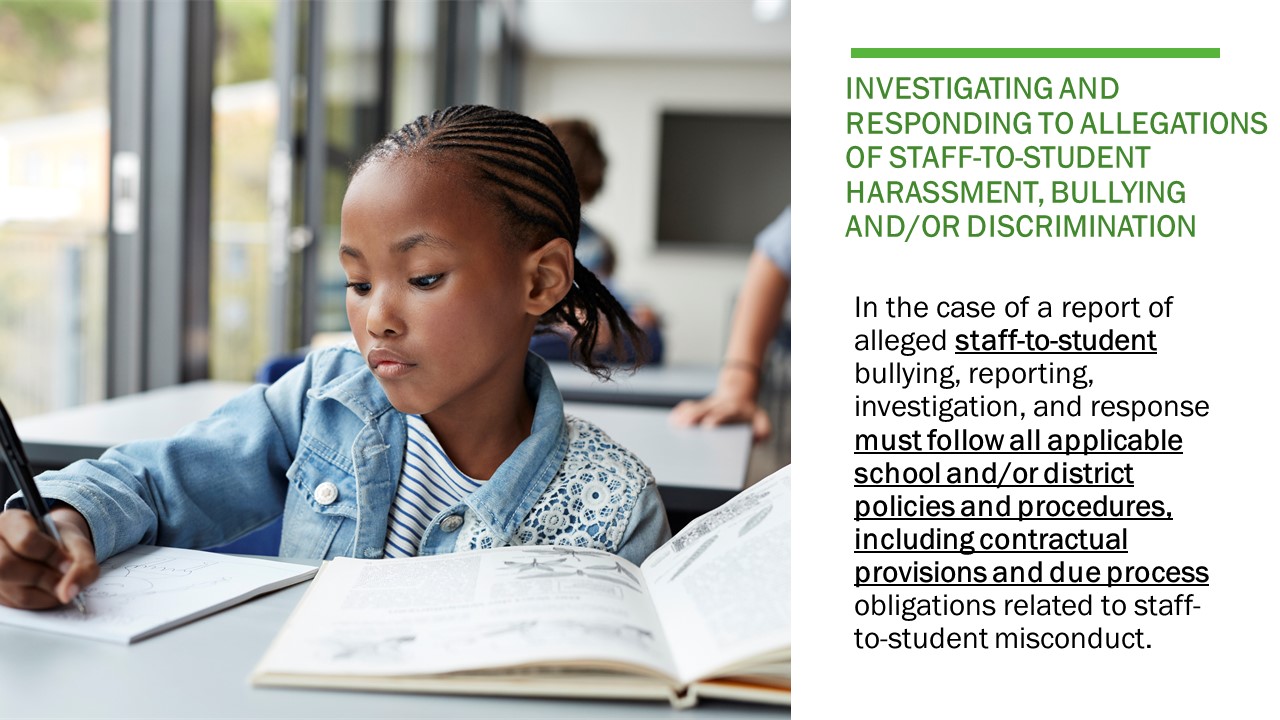 - In the case of a report of alleged staff-to-student bullying, reporting, investigation, and response must follow all applicable school and/or district policies and procedures, including contractual provisions and due process obligations related to staff-to-student misconduct.