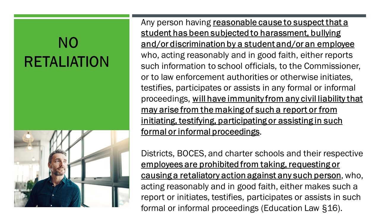 - Districts, BOCES, and charter schools and their respective employees are prohibited from taking, requesting or causing a retaliatory action against any such person, who, acting reasonably and in good faith, either makes such a report or initiates, testifies, participates or assists in such formal or informal proceedings (Education Law §16).