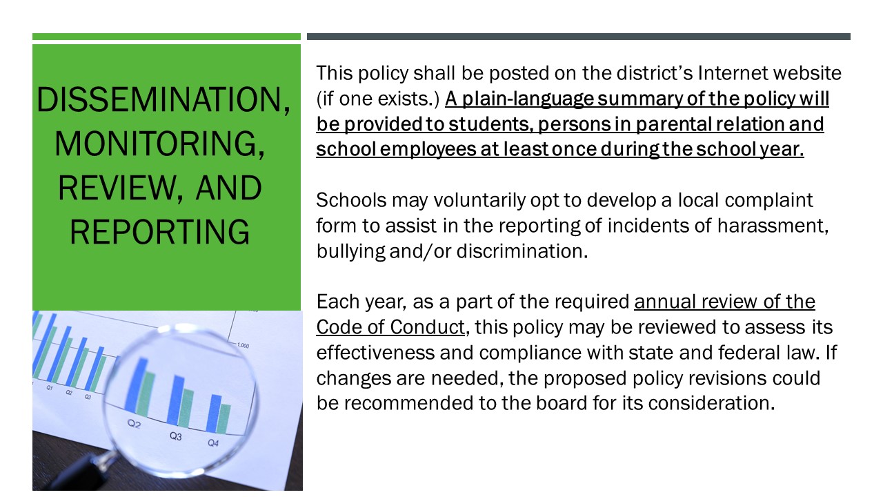- Each year, as a part of the required annual review of the Code of Conduct, this policy may be reviewed to assess its effectiveness and compliance with state and federal law. If changes are needed, the proposed policy revisions could be recommended to the board for its consideration.
