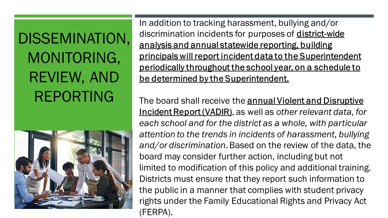 - The board shall receive the annual Violent and Disruptive Incident Report (VADIR), as well as other relevant data, for each school and for the district as a whole, with particular attention to the trends in incidents of harassment, bullying and/or discrimination. Based on the review of the data, the board may consider further action, including but not limited to modification of this policy and additional training. Districts must ensure that they report such information to the public in a manner that complies with student privacy rights under the Family Educational Rights and Privacy Act (FERPA).