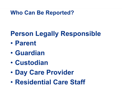 - The SCR only registers reports against a parent, guardian, or other person eighteen years of age or older who is legally responsible for the child.